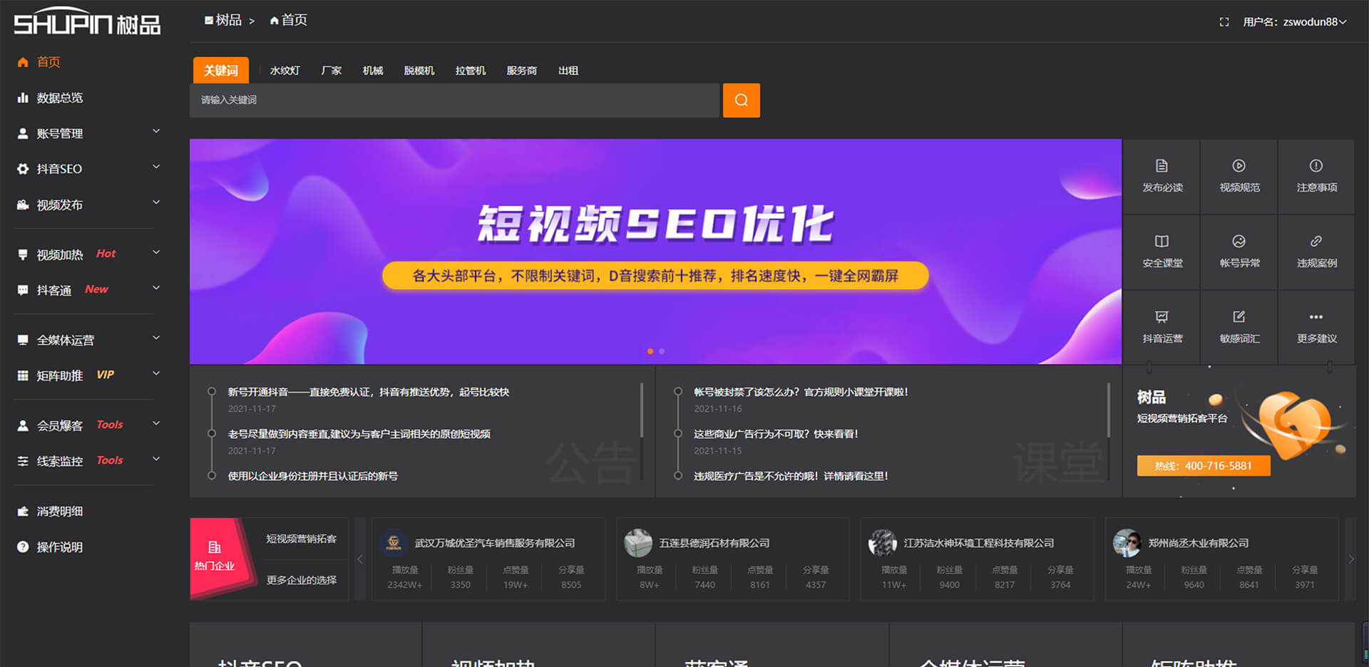 幫助企業(yè)解決在短視頻營(yíng)銷(xiāo)中的內(nèi)容生產(chǎn)、賬號(hào)搭建、賬號(hào)運(yùn)營(yíng) 、精準(zhǔn)低成本引流、業(yè)務(wù)場(chǎng)景、服務(wù)場(chǎng)景、服務(wù)效率等問(wèn)題的短視頻營(yíng)銷(xiāo)拓客平臺(tái)。